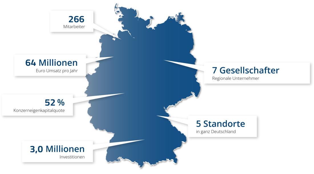 Dadurch ist die Firmengruppe zu einer leistungsfähigen Einheit herangewachsen, in der klare Strukturen für ein effizientes Miteinander sorgen. Menschlich, zukunftsgerichtet, leidenschaftlich und verbindlich sind die Werte, die alle Unternehmen in der Gruppe miteinander verbinden.